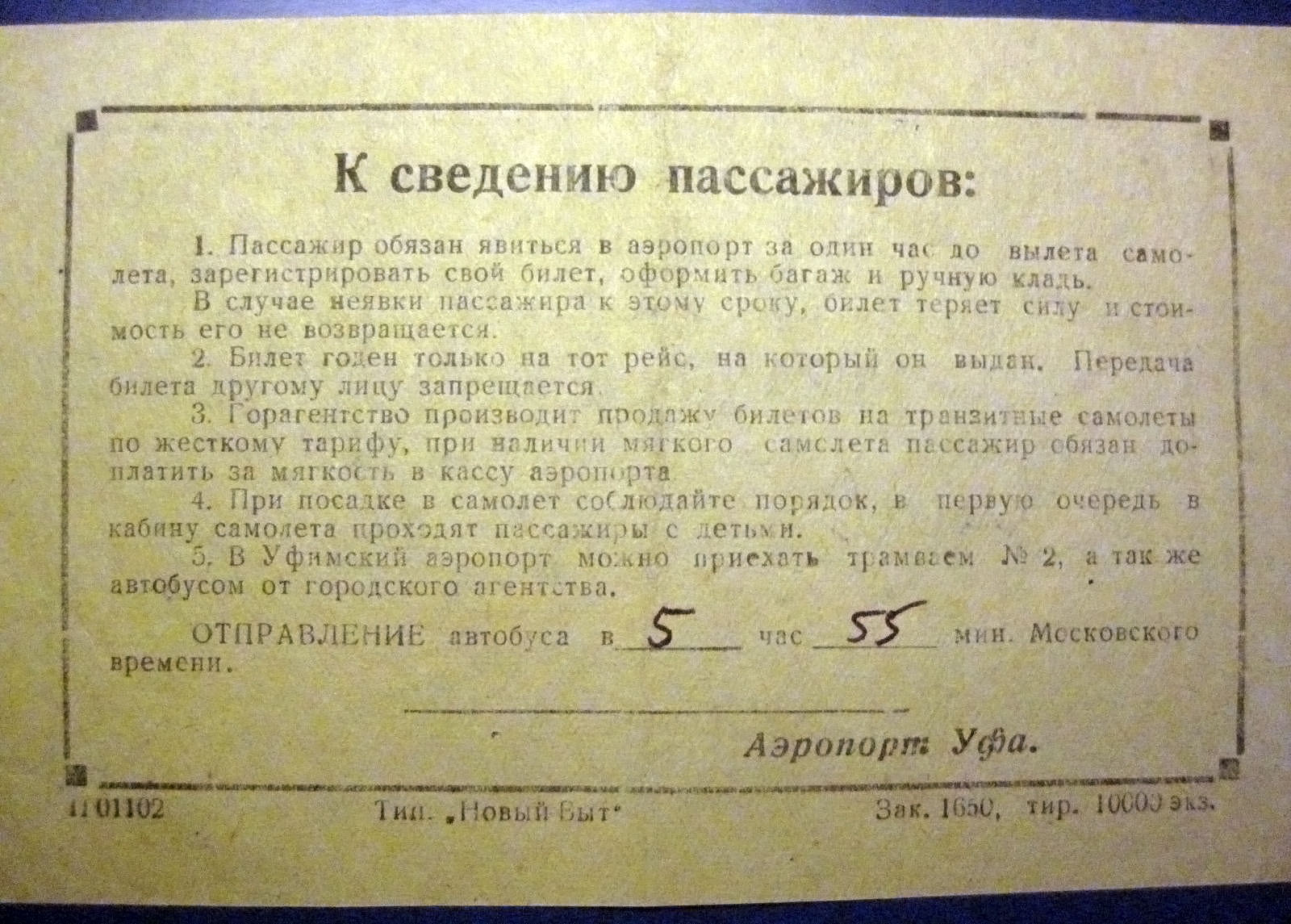 1) В 1955 г. между СССР и другими странами начали заключаться межгосударственные соглашения о воздушном сообщении, в результате чего в Советский Союз стали выполнять рейсы многочисленные иностранные авиакомпании. Далеко не все из них эксплуатировали самолёты советского производства, к которым имели привязку основные ПТ Аэрофлота, поэтому специально для иностранных перевозчиков были созданы нейтральные бланки ПТ, на которых отсутствовало указание типа ВС и в которые можно было вписывать название авиакомпании, а также класс обслуживания. До 1960 г. бланки нейтральных ПТ были полностью на русском языке: