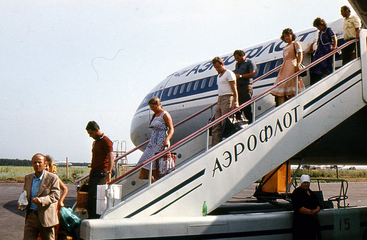 Кстати вот на этой фотке как раз видны места стоянок Ан-24 и Як-40 на ВПП-1 - Ту-154 стоит в западном секторе перрона носом к ВПП-1, вдали слева на ВПП-1 виден стоящий там Як-40, а справа (под фюзеляжем Ту-154) видны стоящие на ВПП-1 Ан-24 (26):